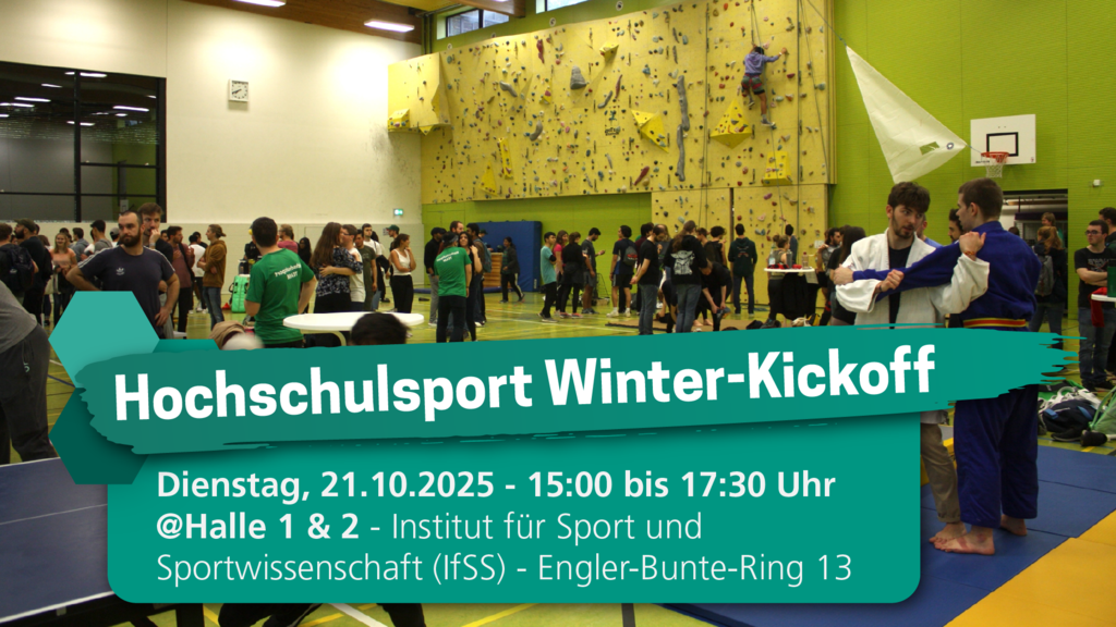 The winter edition of the kickoff will take place on Tuesday, October 21, 2025, from 3:00 to 5:30 p.m., in Hall 2 AND Hall 1 of the IfSS, in buildings 40.44 and 40.40. All interested and sports-enthusiastic students and employees of KIT and the cooperating institutions are cordially invited to attend.